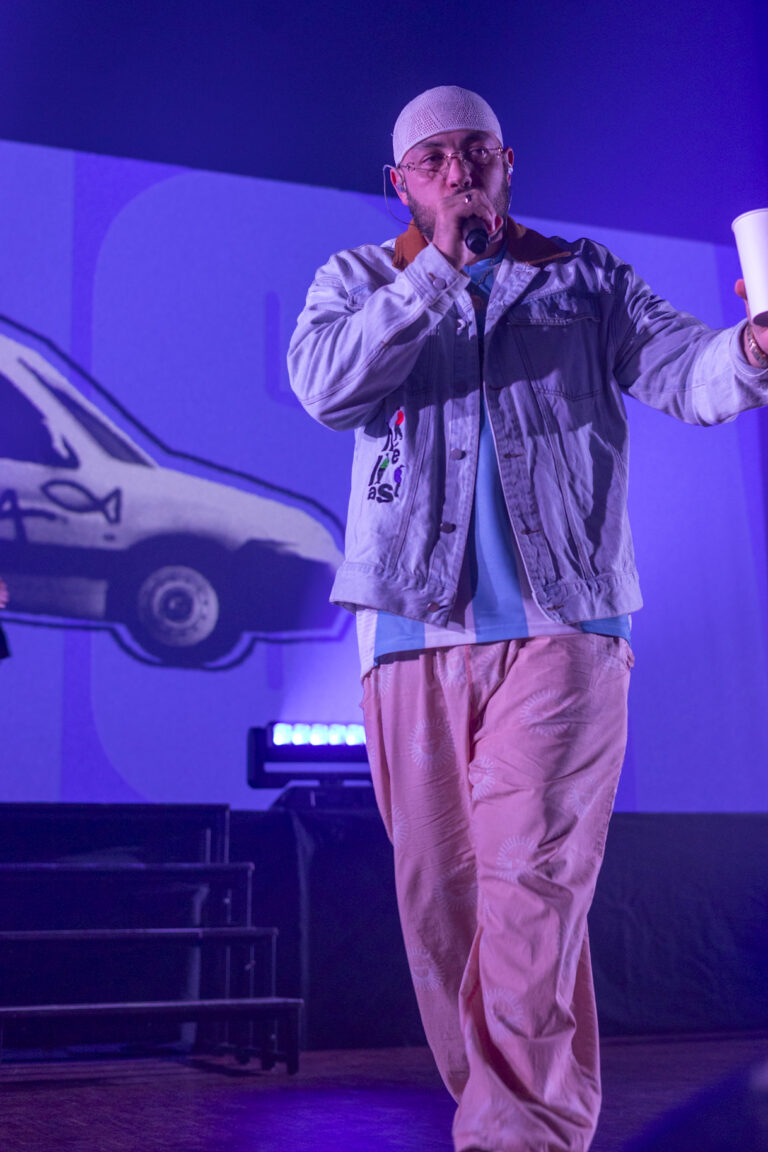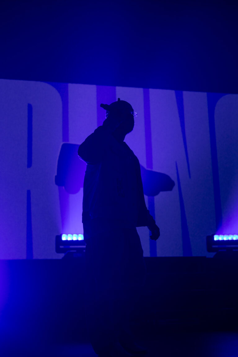 La scénographie reste simple mais efficace : DJ à gauche, une cabine entourée d’une bâche blanche et bleue qui rappelle la cover, et un écran en fond avec des visuels qui accompagnent les morceaux : marché, bâtiments, cascade, poissons…